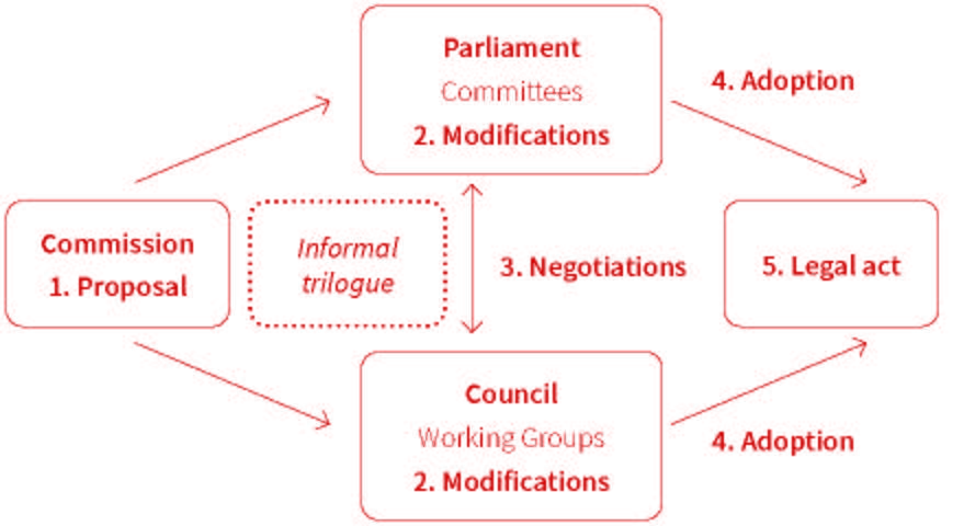 European legislation is created cooperatively by the European Commission, the European Parliament and the Member States, the last of these organized in the Council of the EU. To ensure that legislative work does not take place in an ivory tower, i.e. divorced from the realities of users, interest groups must have the opportunity to contribute their expertise from the field at an appropriate point in the process. These opportunities must be identified and exploited for each item of legislation. An EU legislative procedure usually takes the following form: