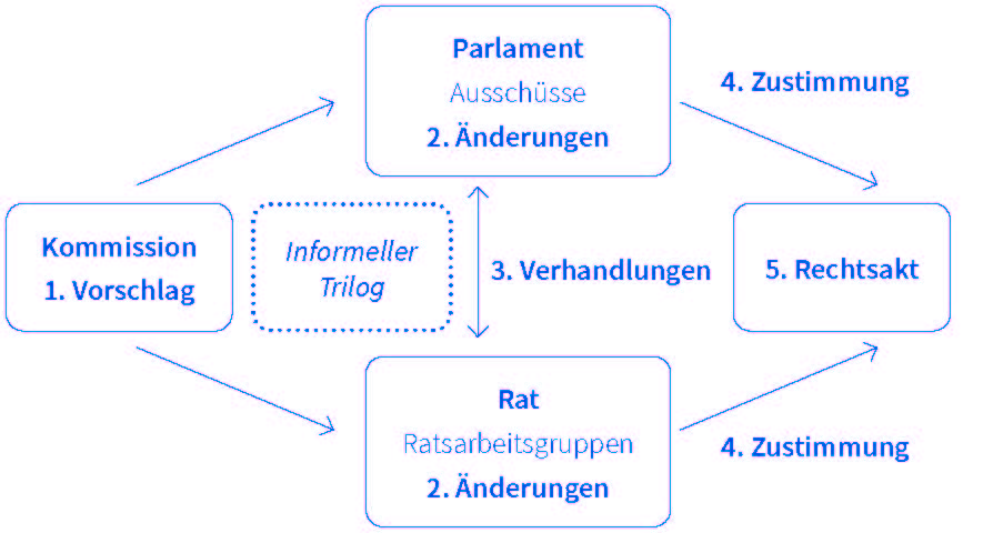 Europäische Gesetzgebung entsteht im Zusammenspiel zwischen der EU-Kommission, dem Europäischen Parlament (EP) und den im Rat der EU organisierten Mitgliedstaaten. Damit die gesetzgeberische Arbeit nicht „im Elfenbeinturm“, also fernab der Realitäten der Anwendenden, stattfindet, müssen sich Interessengruppen mit ihrer Expertise aus der Praxis an geeigneter Stelle in den Prozess einbringen können. Diese Möglichkeiten gilt es für jedes einzelne Verfahren herauszufinden und zu nutzen. Ein EU-Gesetzgebungsverfahren läuft dabei üblicherweise wie folgt ab: