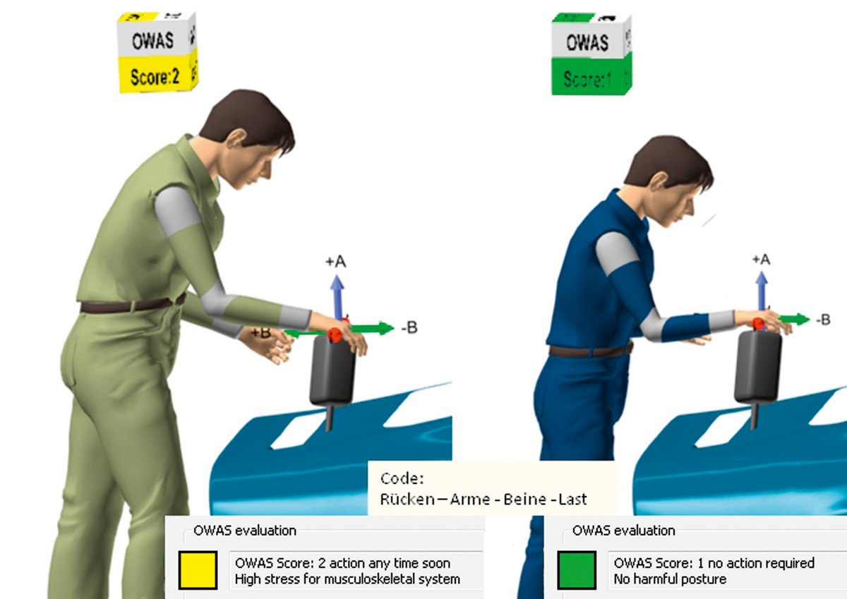 Üblicherweise werden in arbeitswissenschaftlichen digitalen Menschmodellen standardisierte, ergonomische Verfahren (bspw. nach DIN 1005-4, OWAS-Körperhaltungsanalyse1 oder auch Leitmerkmalmethoden2) softwaretechnisch zur Verfügung gestellt. So lassen sich Gesundheitsrisiken abschätzen und daraus prospektive oder korrektive Maßnahmen zur Optimierung eines Arbeitssystems ableiten (z. B. nach DIN EN ISO 6385).
