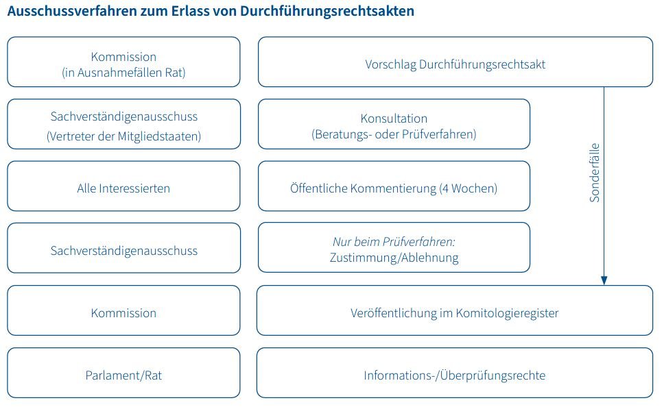 Nach diesem sogenannten Komitologieverfahren wird bei der Erstellung von Durchführungsrechtsakten eine Sachverständigengruppe konsultiert. Dieser Ausschuss setzt sich aus Vertreterinnen und Vertretern der Mitgliedstaaten zusammen. Dadurch ist es diesen möglich, sich in die Annahme eines Durchführungsrechtsaktes einzubringen. Dieses Verfahren ist allerdings nicht für alle Durchführungsrechtsakte vorgeschrieben: In bestimmten Fällen, wie der Zuteilung von Finanzhilfen unterhalb einer bestimmten Höhe, kann die Kommission Durchführungsrechtsakte ohne Konsultation eines Ausschusses erlassen.