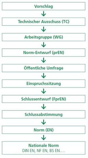 Der vorliegende Artikel beschreibt die Abläufe am Beispiel von Deutschland. Bis auf kleinere Abweichungen läuft das Normungsverfahren bei den übrigen CEN-Mitgliedern genauso ab.