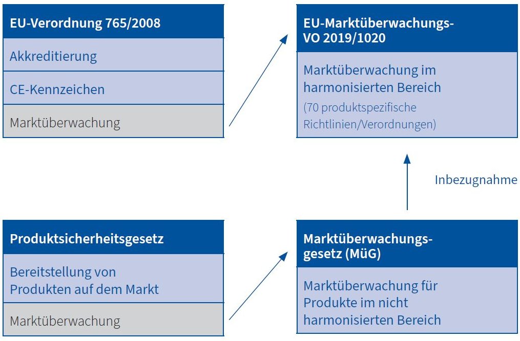 Bisher war in Deutschland das Produktsicherheitsgesetz alleinige Grundlage für die Marktüberwachung und die sich daraus ergebenden verwaltungsrechtlichen Maßnahmen, um die sicherheitstechnischen Anforderungen an die Bereitstellung von Produkten auf dem Markt durchzusetzen. Nunmehr ist für Produkte, für die es harmonisierende europäische Rechtsvorschriften gibt, die Verordnung (EU) 2019/1020 die maßgebliche Rechtsvorschrift in Bezug auf die Produktsicherheit. Für nicht harmonisierte Produkte gilt das Gesetz zur Marktüberwachung und zur Sicherstellung der Konformität von Produkten